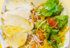 Листья салата, томаты, огурцы, мясо курицы ,сладкий перец, лаваш, оливки, лимон, кунжут. 250гр