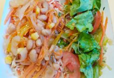 350 г • Рис Басмати , сладкий перец, оливки , кукуруза, фасоль, лук, томаты, морковь, зелень.